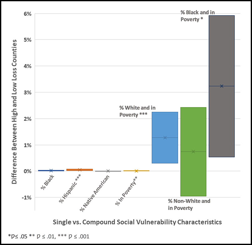 In Figure 2, we take the analysis of interactions a step further, dividing counties into two categories: those experiencing annual per capita losses above or below the national average from 2010 to 2019. The differences among individual race, ethnicity, and poverty variables between the two county groups are small. But expressing race together with poverty (poverty attenuated by race) produces quite different results: Counties with high hazard losses have higher percentages of both impoverished Black populations and impoverished white populations than counties with low hazard losses. These county differences are most pronounced for impoverished Black populations.